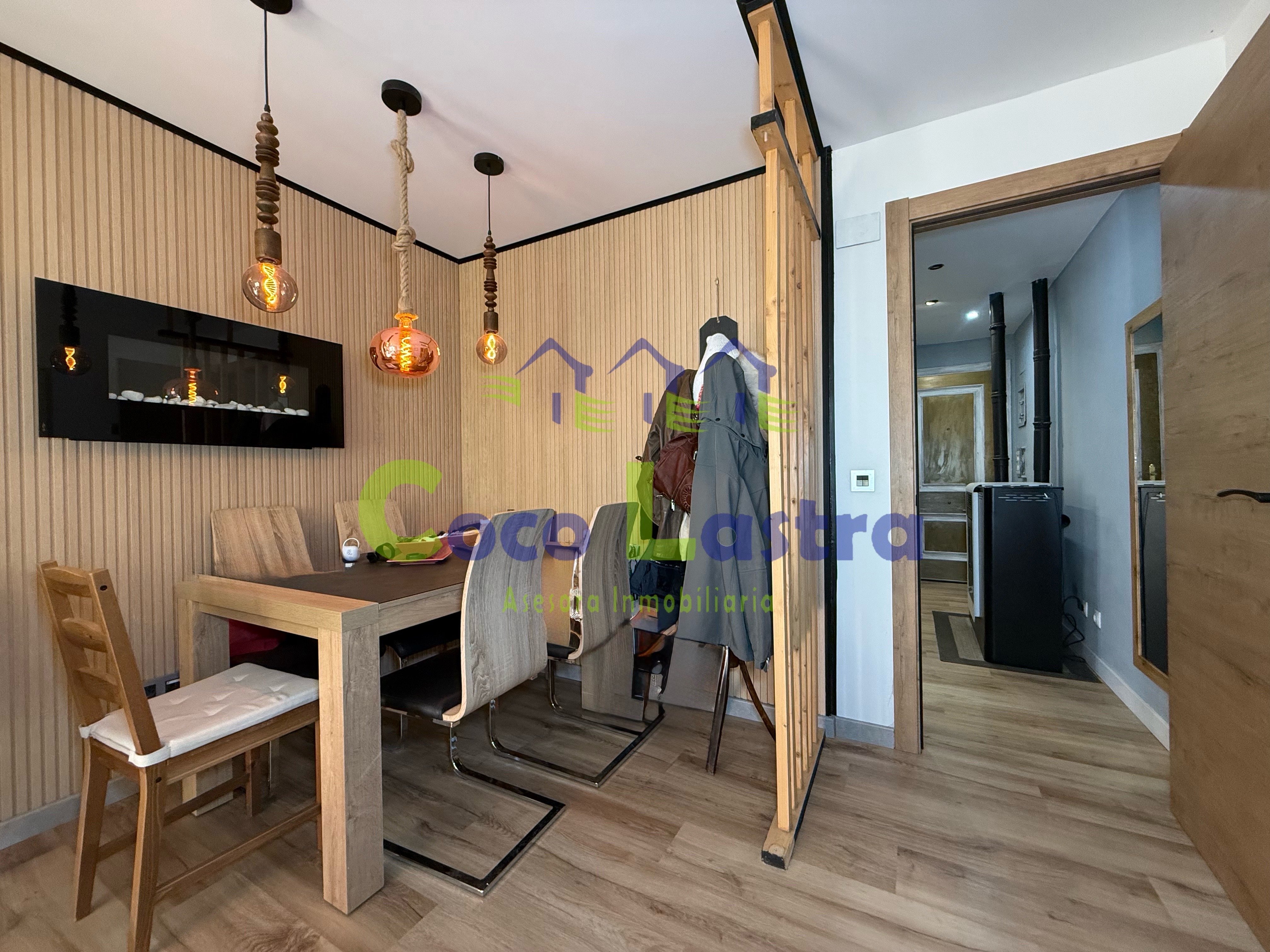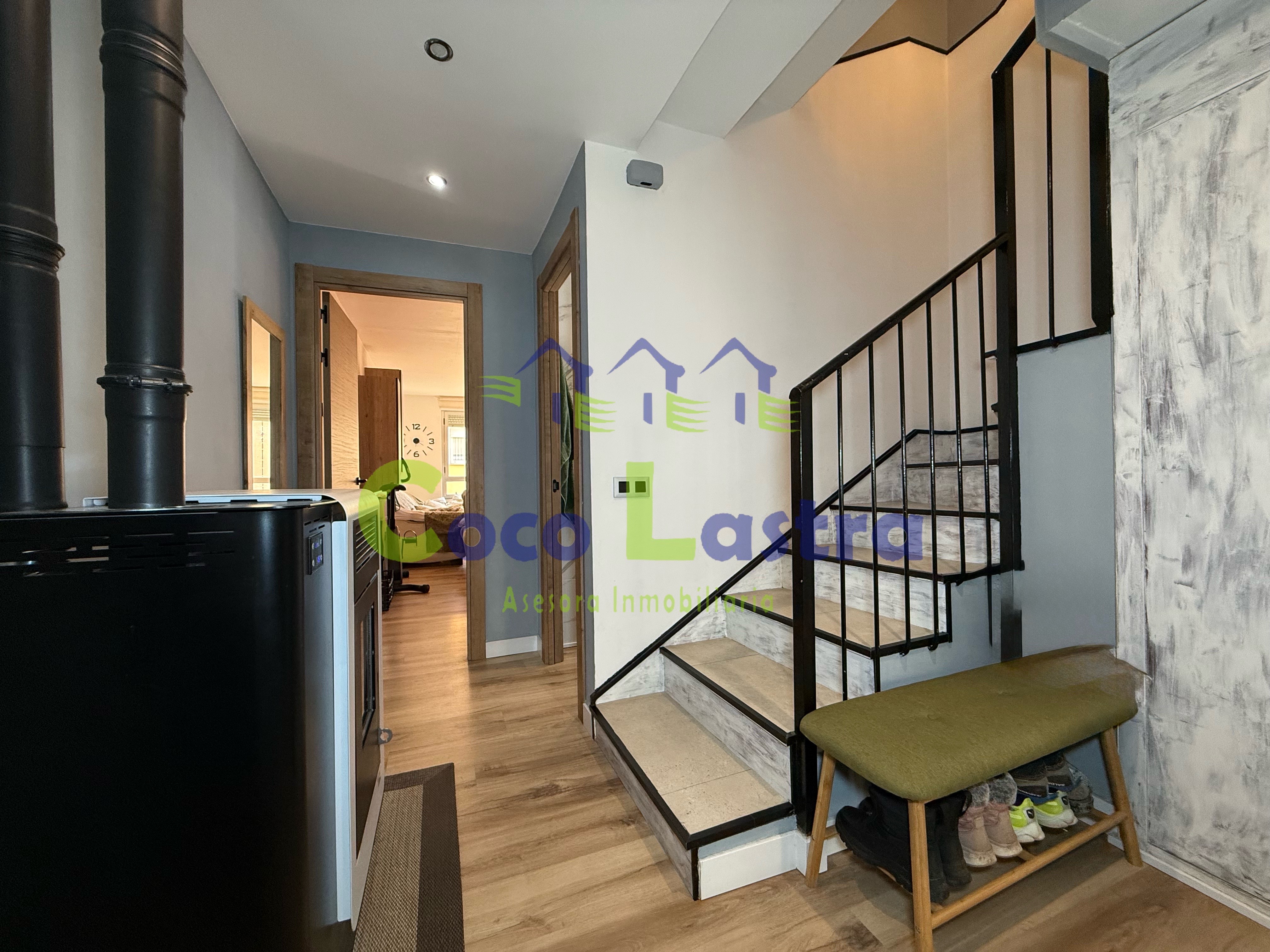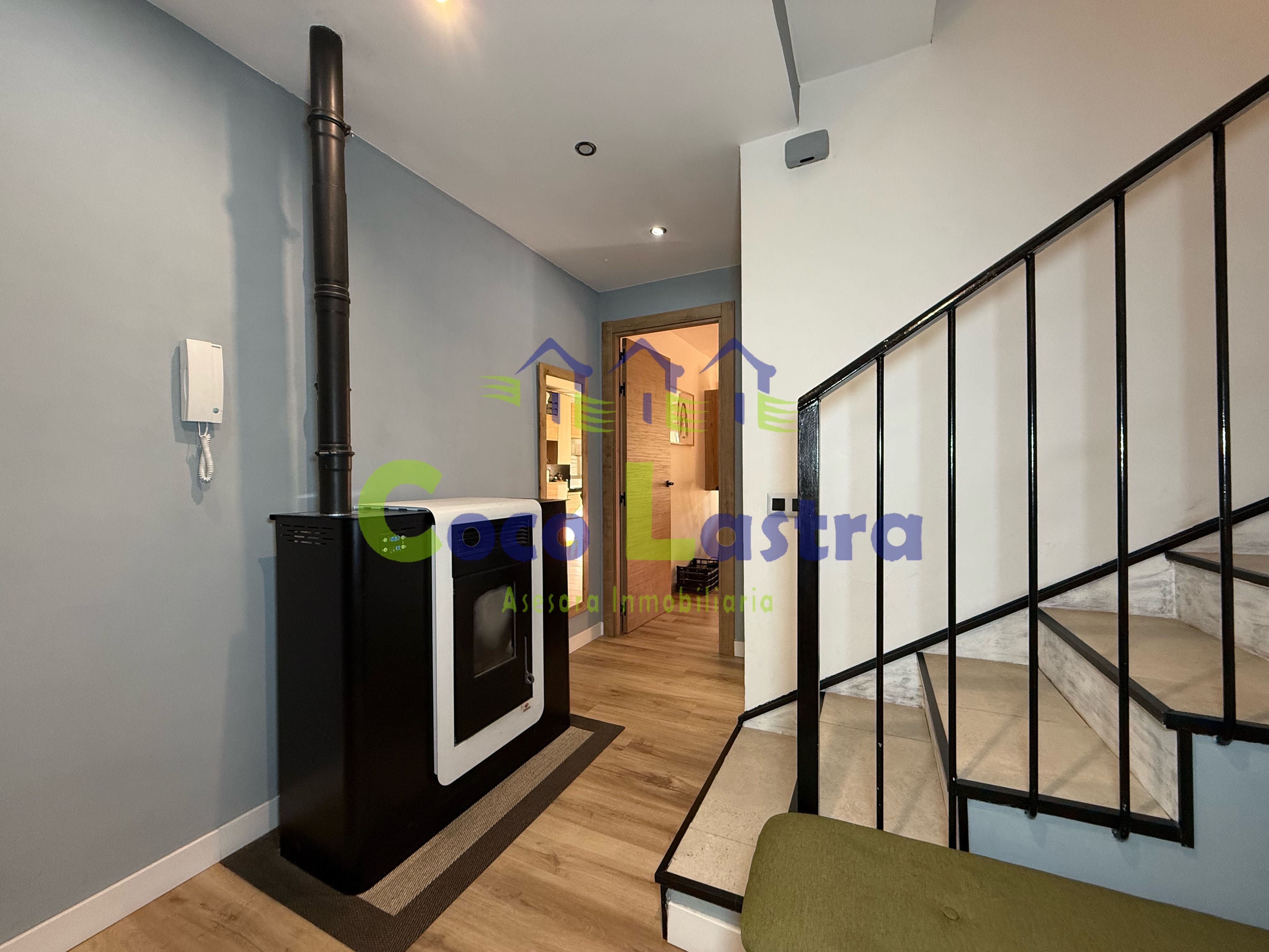 Dispone de calefacción individual mediante caldera de pellets, termo eléctrico para el agua caliente sanitaria, y además, ventanas de aluminio con doble cristal, puertas de madera, suelos de tarima laminada y cerámica, pintura lisa en paredes y techos sin moldura de escayola.