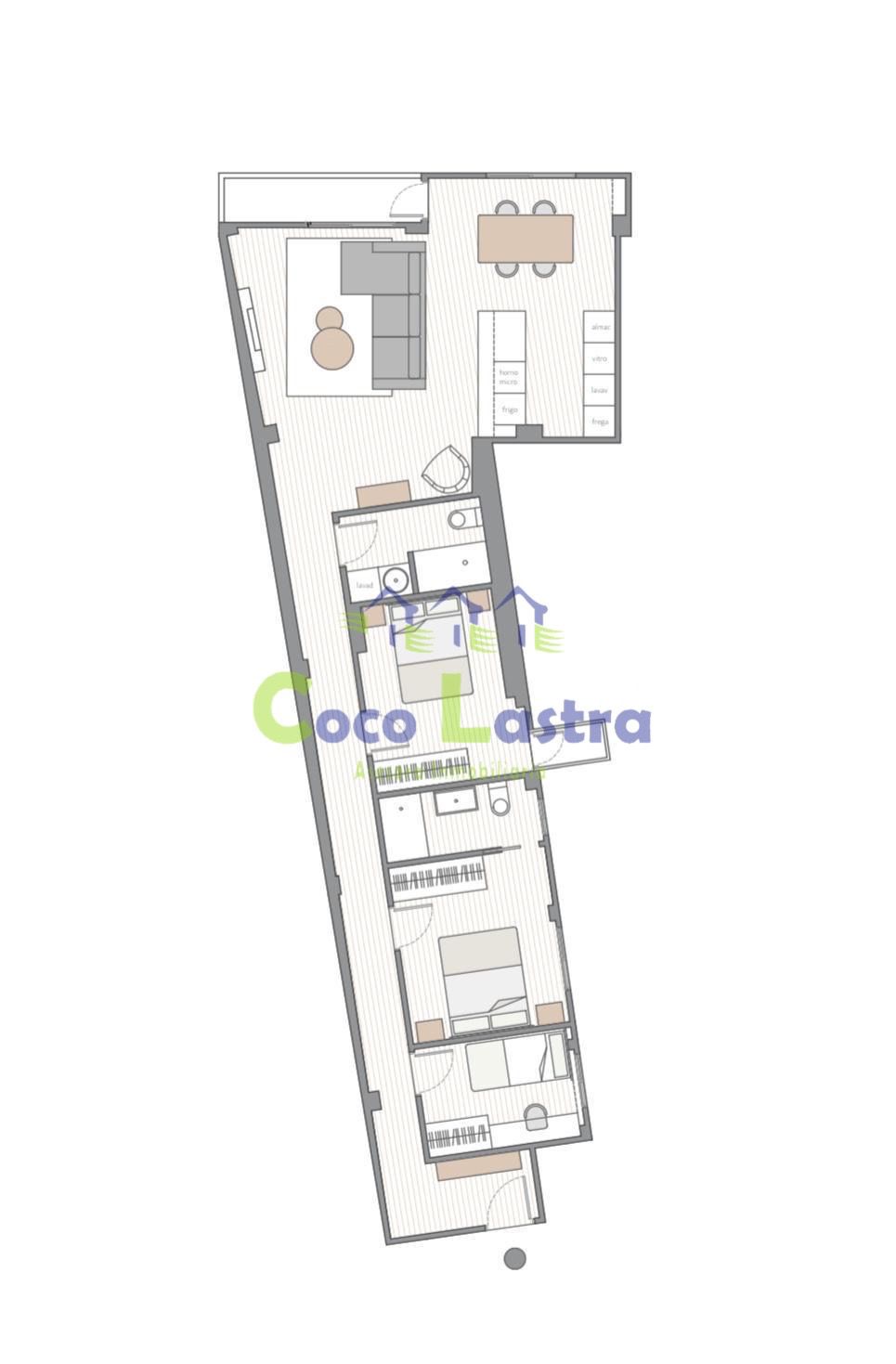 Está orientada al sur y cuenta con una superficie aproximada de 115 m2 construidos y distribuidos de la mejor manera para aprovechar todo el espacio. Hall de entrada, pasillo distribuidor, un estupendo salón-comedor-cocina con grandes ventanales, y un balcón con vistas al Paseo, tres dormitorios con armarios empotrados y revestidos en su interior, el principal a modo de suite con uno de los dos baños incorporado, balcón hacia el patio de luces y otro cuarto de baño con acceso desde el pasillo distribuidor. Ambos con plato de ducha.